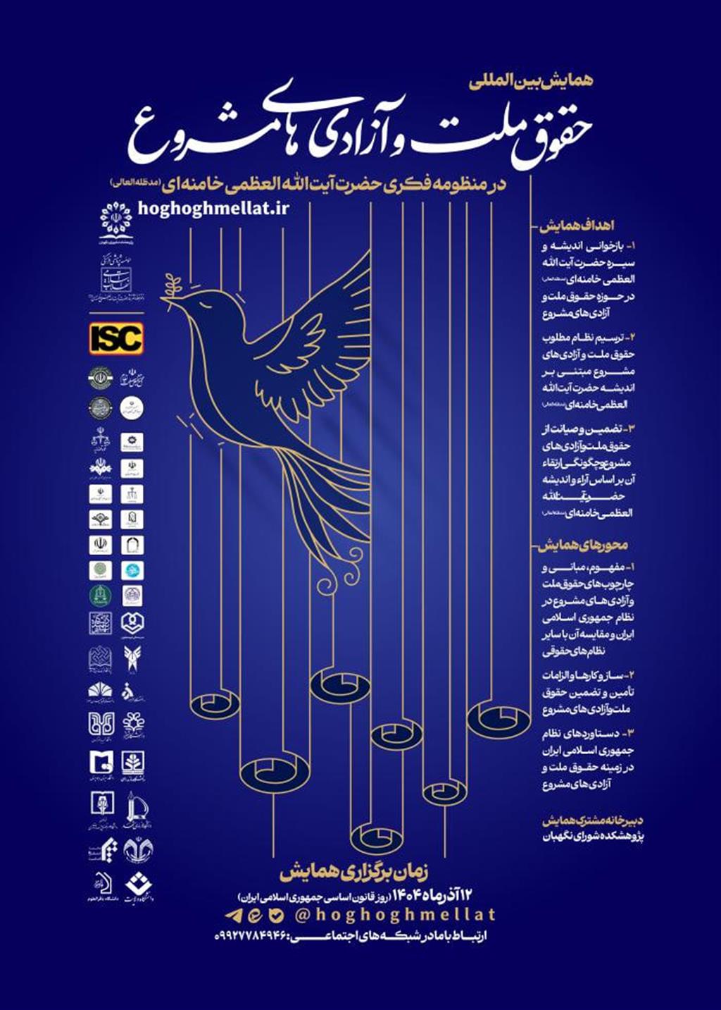 همایش بین المللی حقوق ملت و آزادی های مشروع در منظومه فکری حضرت آیت الله العظمی خامنه ای(مدظله العالی) روز چهارشنبه، 12 آذر، 1404 توسط پژوهشکده شورای نگهبان، موسسه فرهنگی پژوهشی انقلاب اسلامی و تحت حمایت سیویلیکا در شهر تهران برگزار می شود.