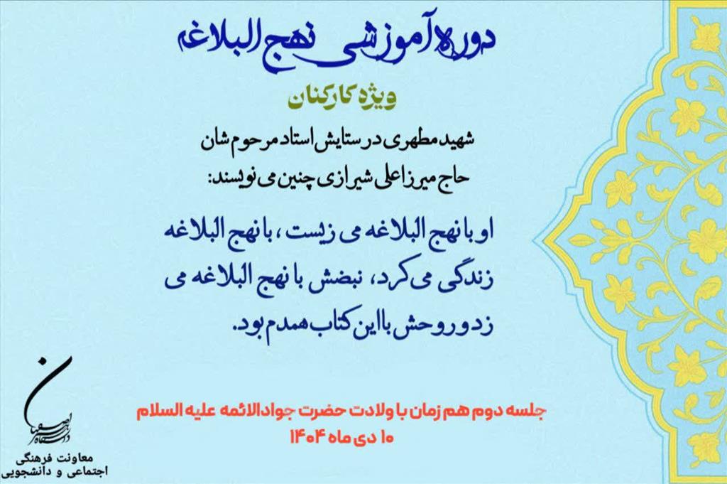 دومین جلسه دوره آموزشی آشنایی و انس با گنجینه ارزشمند نهج البلاغه ویژه کارکنان دانشگاه هنر اصفهان ؛ صبح چهارشنبه 10دی ماه 1404 ساعت 7:30 صبح با حضور حجت الاسلام دکتر زکی زاده نویسنده، مترجم و پژوهشگر حوزه نهج البلاغه در دانشکده کارآفرینی تشکیل می شود.