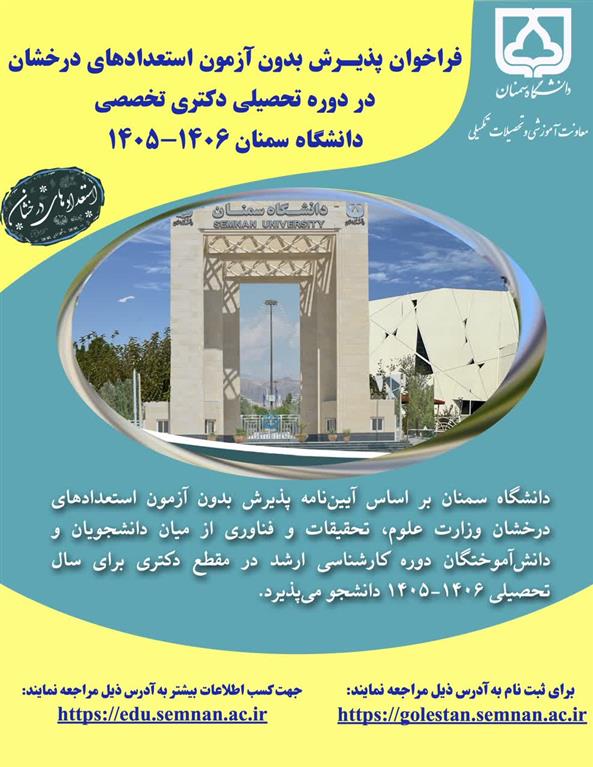فراخوان پذیرش بدون آزمون ( استعدادهای درخشان) مقطع دکتری سال تحصیلی 06- 1405 دانشگاه سمنان