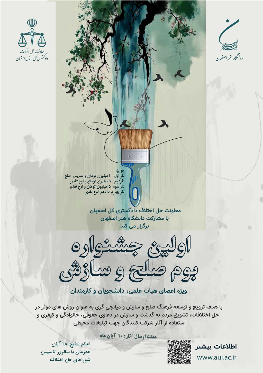 به منظور ترویج فرهنگ گذشت، سازش در دعاوی و میانجی گری و گسترش روحیه صلحطلبی در جامعه، نخستین جشنواره «بوم صلح و سازش» به همت دانشگاه هنر اصفهان و معاونت حل اختلاف دادگستری کل اصفهان برگزار میشود. از کلیه دانشگاهیان دانشگاه هنر اصفهان دعوت میشود با آثار خود در این رویداد فرهنگی شرکت نمایند.