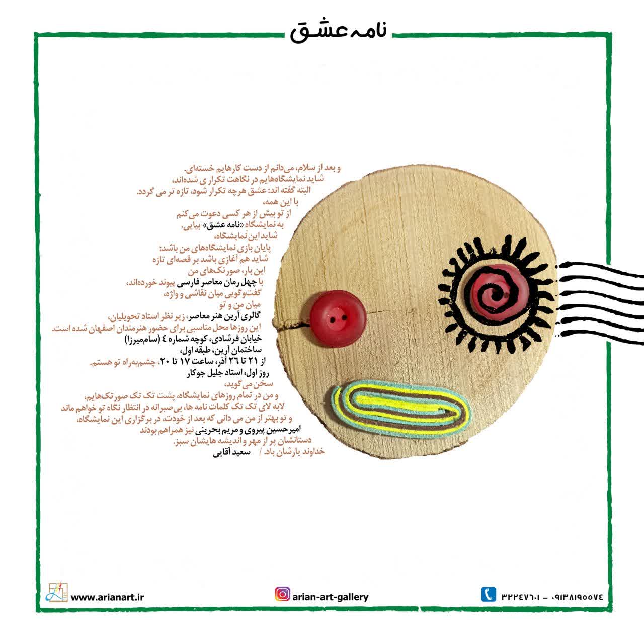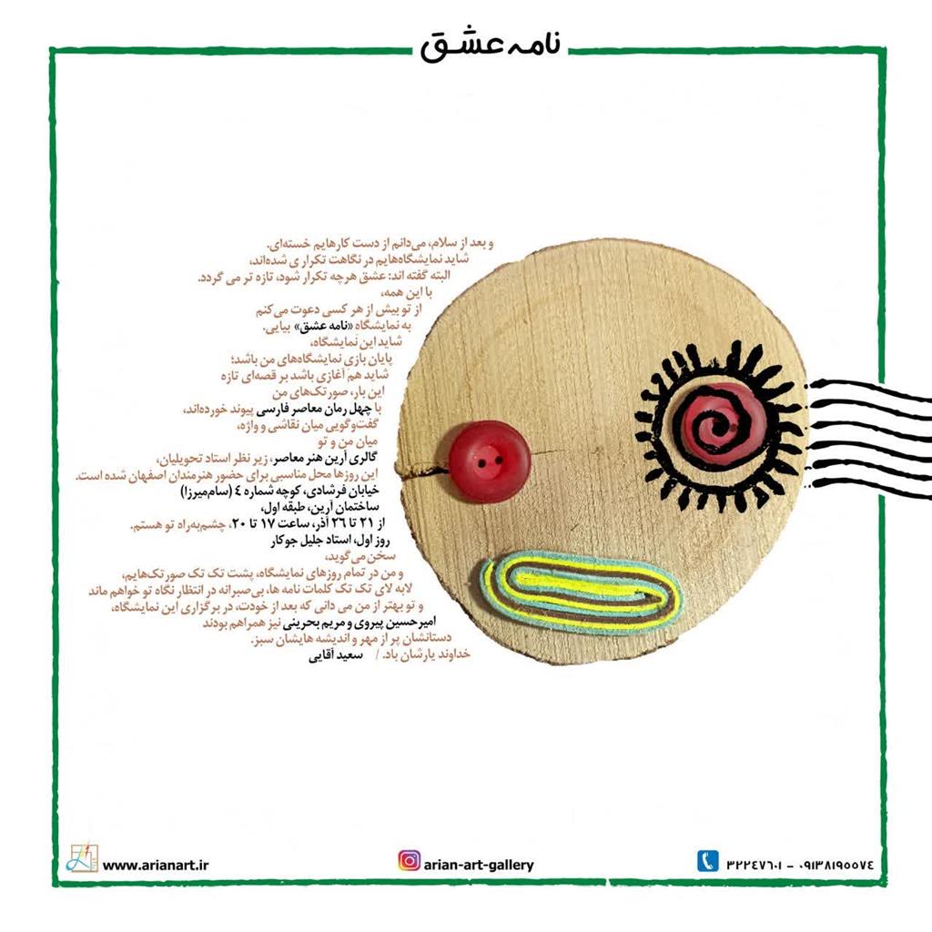 نمایشگاه « نامه عشق» با آثاری از سعید آقایی که با همکاری و همراهی هنرمندانه «امیرحسین پیروی، مریم بحرینی و عفت محمدی» خلق شده اند، روز جمعه 21 آذر ماه گشایش مییابد و تا روز چهارشنبه 26 آذر دایر خواهد بود.