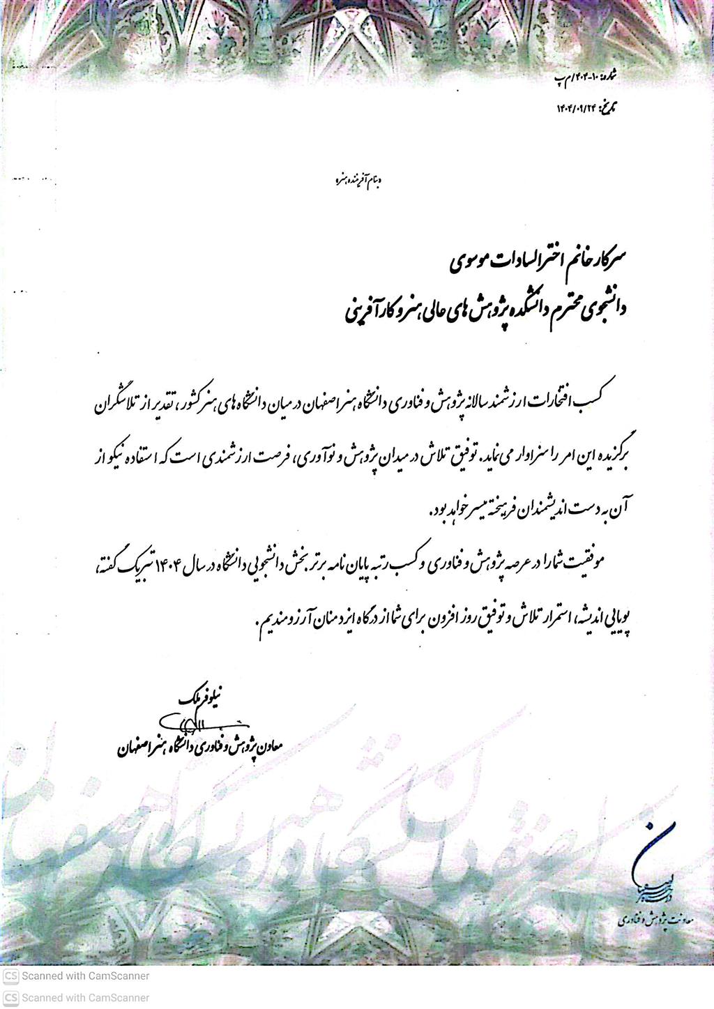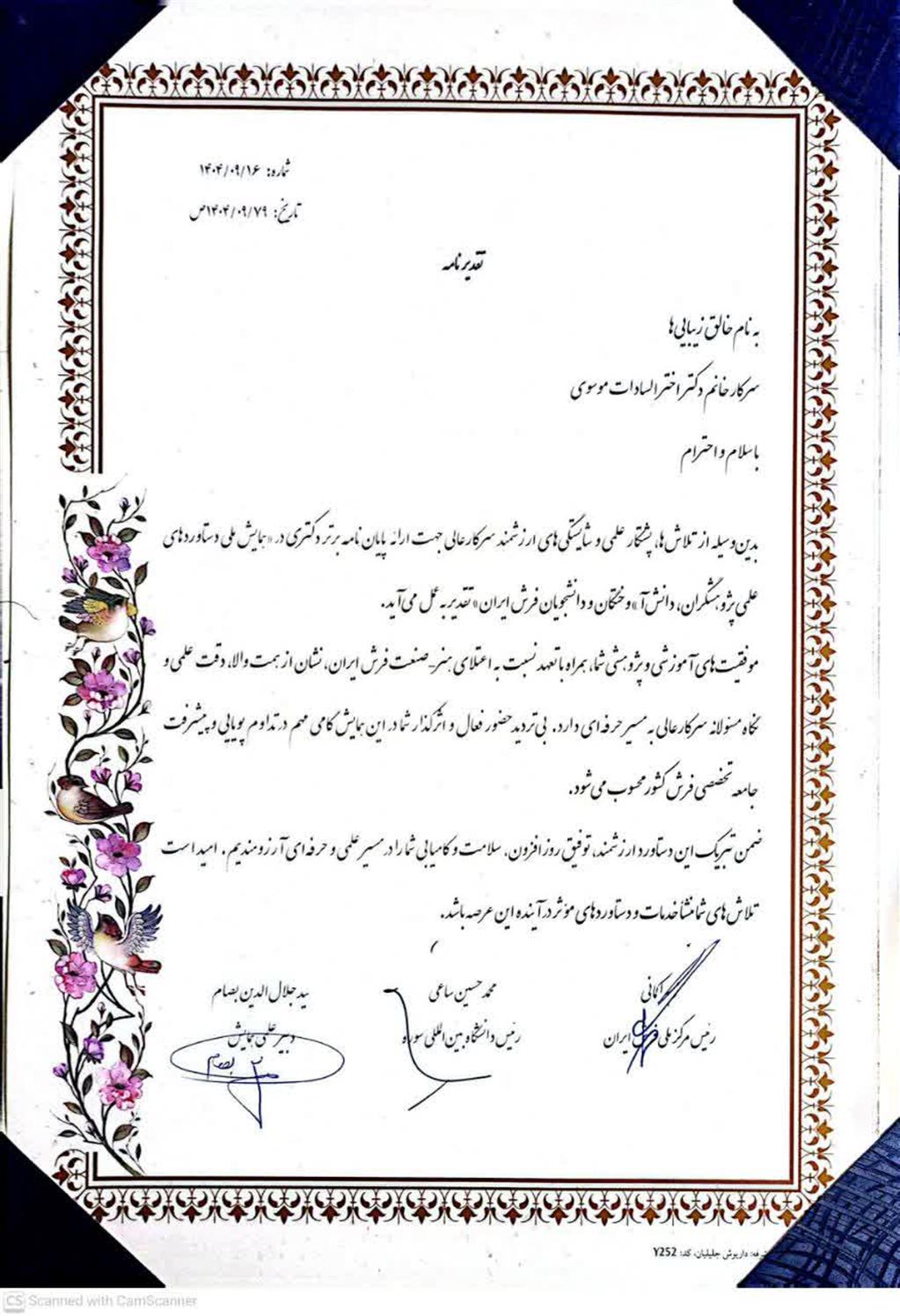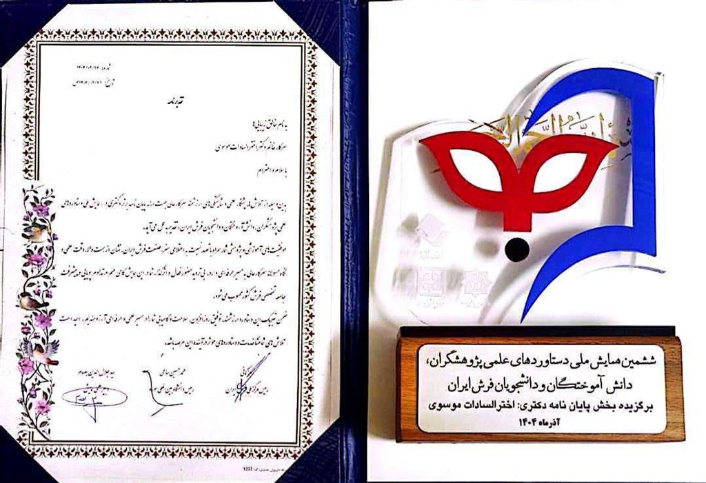 در این رویداد ملی، سرکار خانم دکتر اخترالسادات موسوی، دانشآموخته مقطع دکتری رشته پژوهش هنر از دانشگاه هنر اصفهان، بهدلیل کیفیت علمی، نوآوری پژوهشی و اهمیت موضوع رساله، موفق به کسب عنوان «برگزیده بخش پایاننامه برتر دکتری در حوزه فرش» شد. همچنین ایشان در هفته پژوهش در سال جاری موفق به کسب رتبه پایان نامه برتر بخش دانشجویی دانشگاه در دانشکده پژوهش های عالی هنر و کارآفرینی نیز شدند..