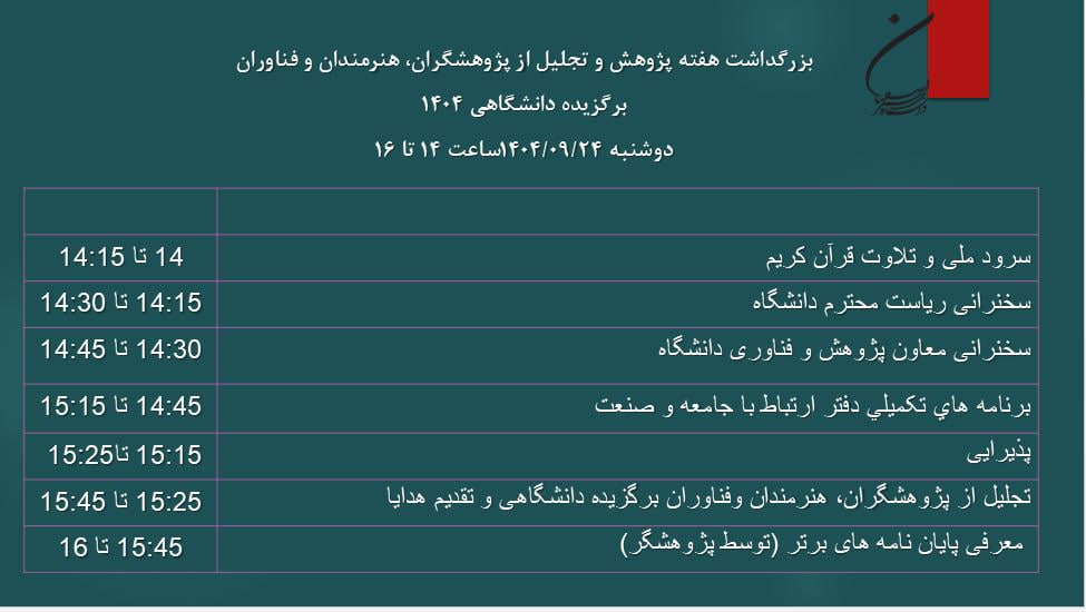 • اعلام برنامه های مراسم پایانی جشنواره تجلیل از پژوهشگران، هنرمندان و فناوران برگزیده دانشگاهی 1404 برنامه مراسم پایانی
