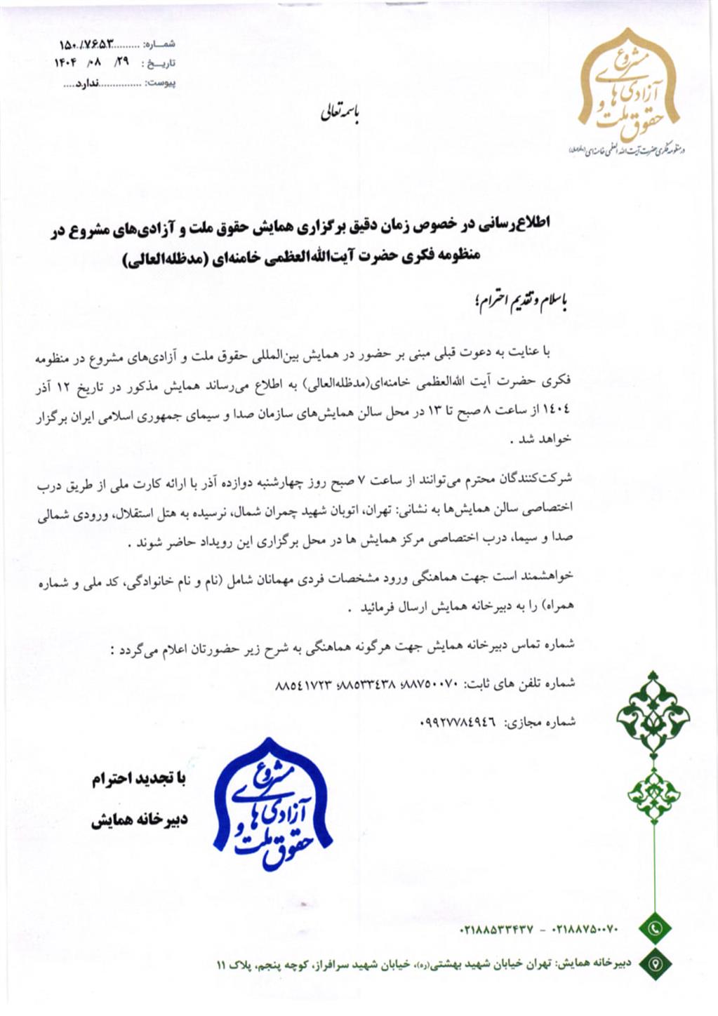 همایش بین المللی حقوق ملت و آزادی های مشروع در منظومه فکری حضرت آیت الله العظمی خامنه ای(مدظله العالی) روز چهارشنبه، 12 آذر، 1404 توسط پژوهشکده شورای نگهبان، موسسه فرهنگی پژوهشی انقلاب اسلامی و تحت حمایت سیویلیکا در شهر تهران برگزار می شود.