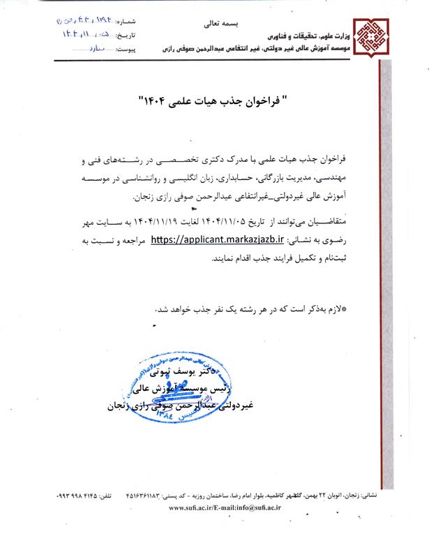 اعلام فراخوان جذب هیات علمی 1404 موسسه آموزش عالی عبدالرحمن صوفی رازی زنجان