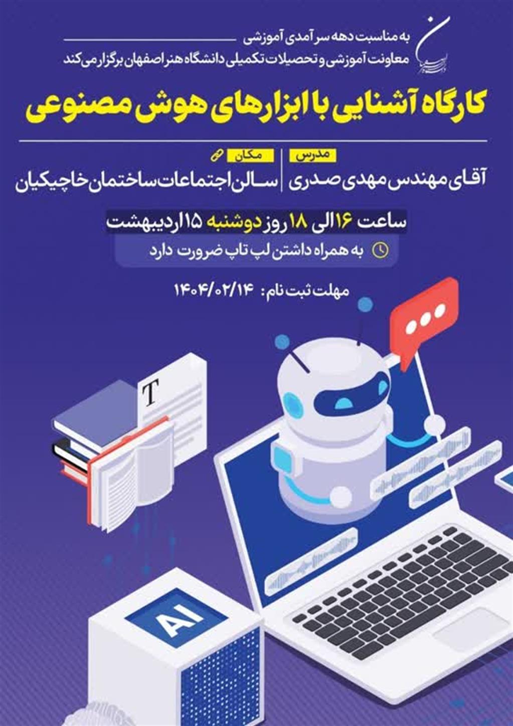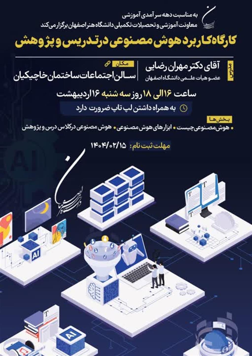 به اطلاع می رساند معاونت آموزشی و تحصیلات تکمیلی دانشگاه به مناسبت دهه سرآمدی آموزشی اقدام به برگزاری دوره های دانش افزایی ویژه اعضا هیأت علمی دانشگاه هنر اصفهان با عناوین «کارگاه آشنایی با ابزار های هوش مصنوعی» و « کاربرد هوش مصنوعی در تدریس و پژوهش» نموده است.