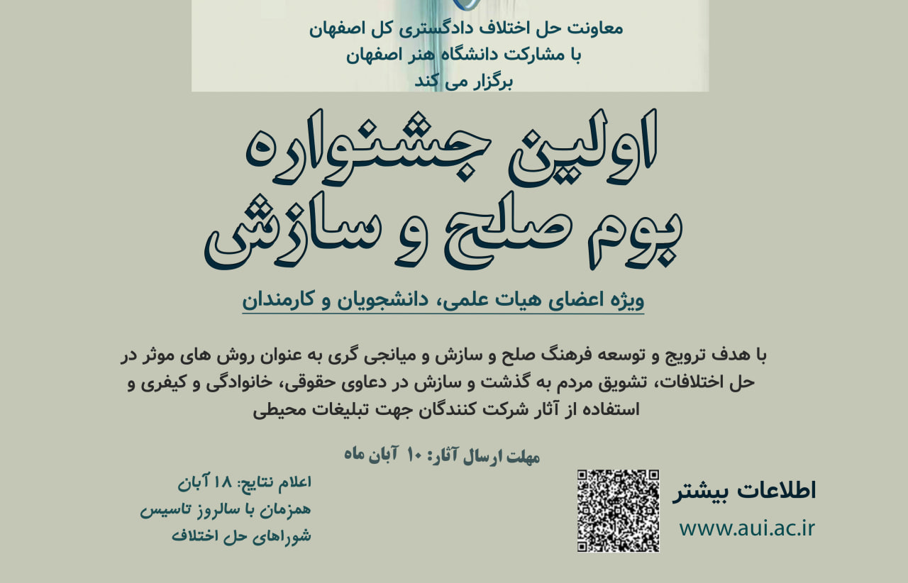 به منظور ترویج فرهنگ گذشت، سازش در دعاوی و میانجی گری و گسترش روحیه صلحطلبی در جامعه، نخستین جشنواره «بوم صلح و سازش» به همت دانشگاه هنر اصفهان و معاونت حل اختلاف دادگستری کل اصفهان برگزار میشود. از کلیه دانشگاهیان دانشگاه هنر اصفهان دعوت میشود با آثار خود در این رویداد فرهنگی شرکت نمایند.