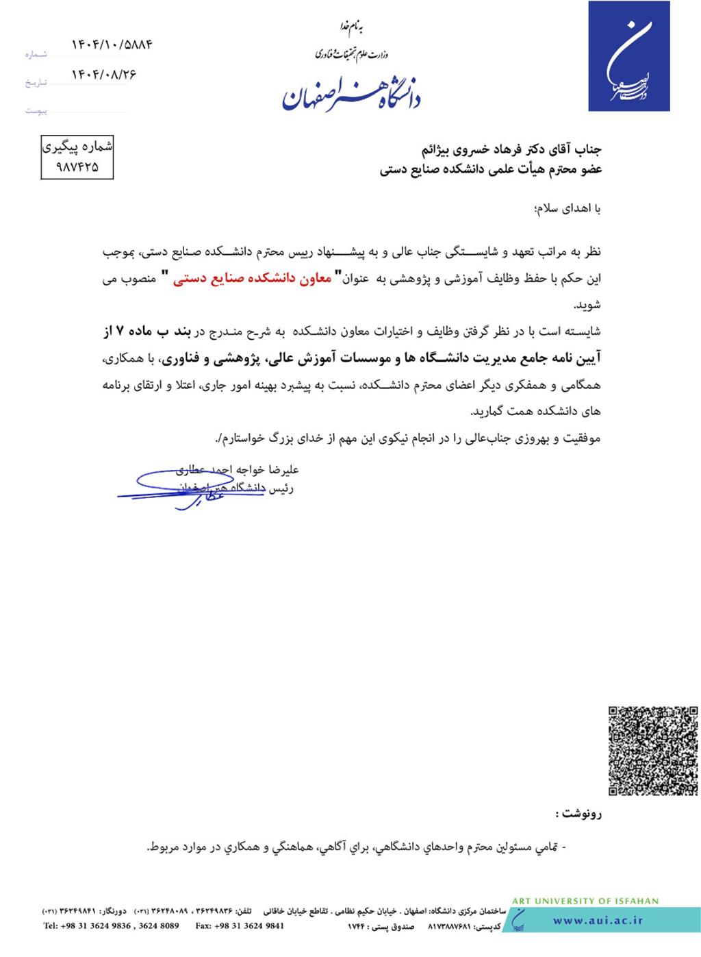 بنا به پیشنهاد رییس دانشکده صنایع دستی، طی حکمی از سوی آقای دکتر علیرضا خواجه احمد عطاری رییس دانشگاه هنر اصفهان، آقای دکتر فرهاد خسروی بیژائم، عضو هیات علمی دانشکده صنایع دستی، با حفظ وظایف آموزشی و پژوهشی به عنوان " معاون دانشکده صنایع دستی " انتخاب گردید.