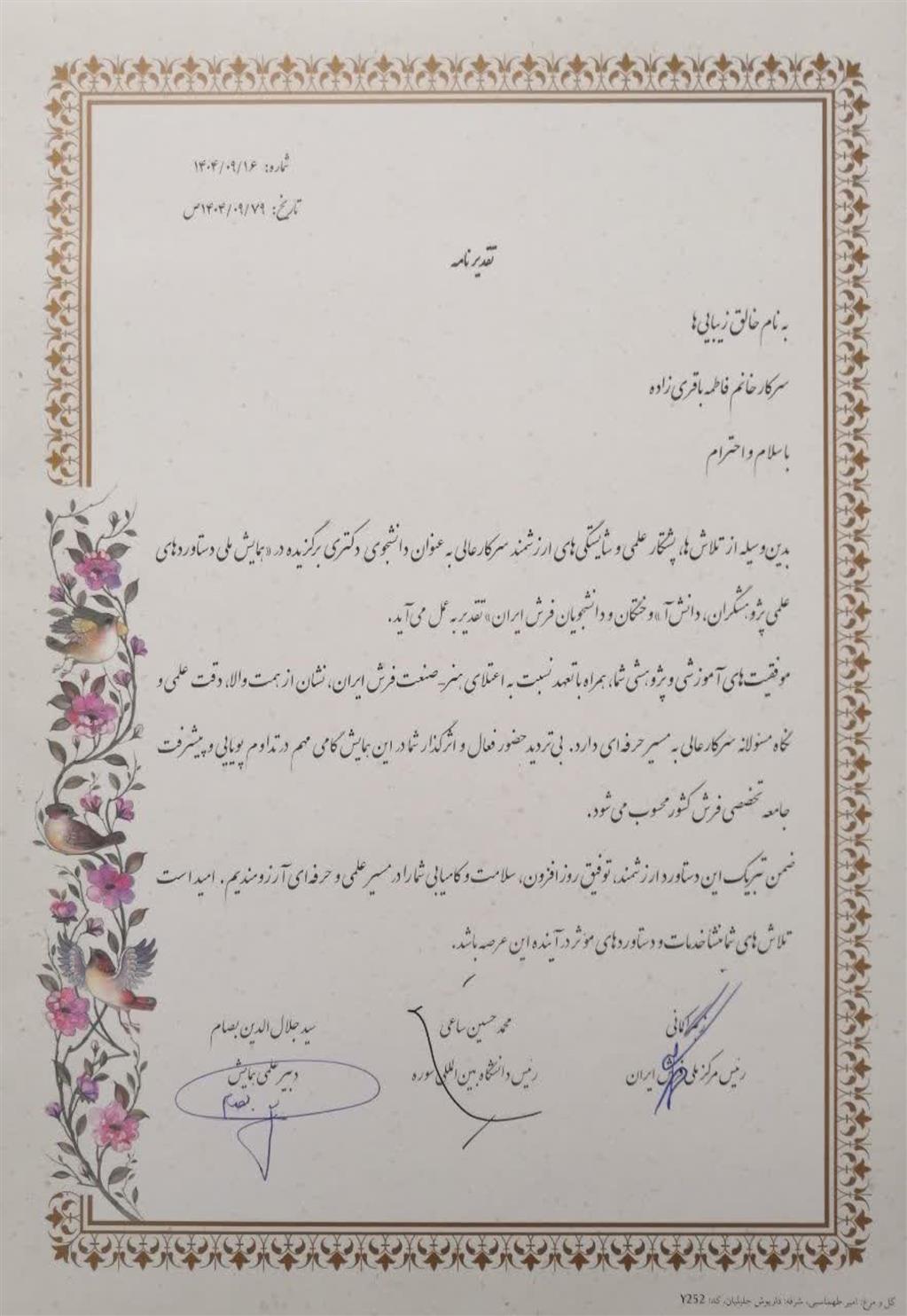 در این برنامه؛ خانم فاطمه باقری زاده دانشجوی دکتری هنرهای اسلامی دانشگاه هنر اصفهان موفق به کسب عنوان «برگزیده بخش دانشجوی برتر دکتری در حوزه فرش» گردید.