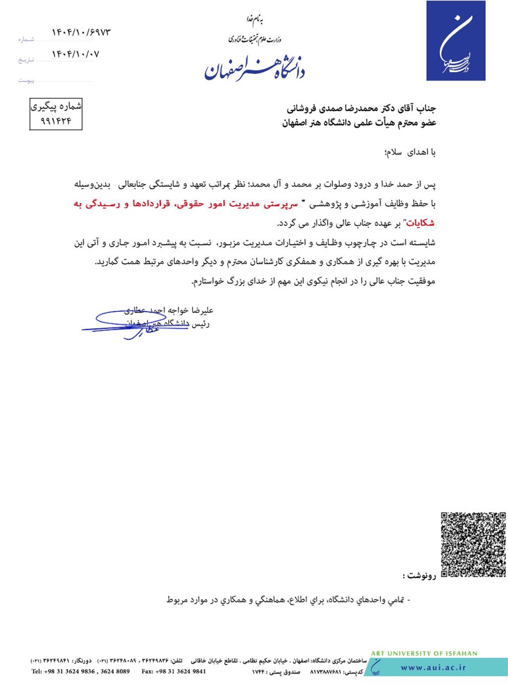 طی حکمی از سوی آقای دکتر علیرضا خواجه احمد عطاری رییس دانشگاه هنر اصفهان، آقای دکتر محمدرضا صمدی فروشانی عضو هیات علمی گروه آموزشی دروس عمومی و معارف اسلامی، با حفظ وظایف آموزشی و پژوهشی، به عنوان سرپرست مدیریت امور حقوقی، قراردادها و رسیدگی به شکایات دانشگاه، منصوب شد.