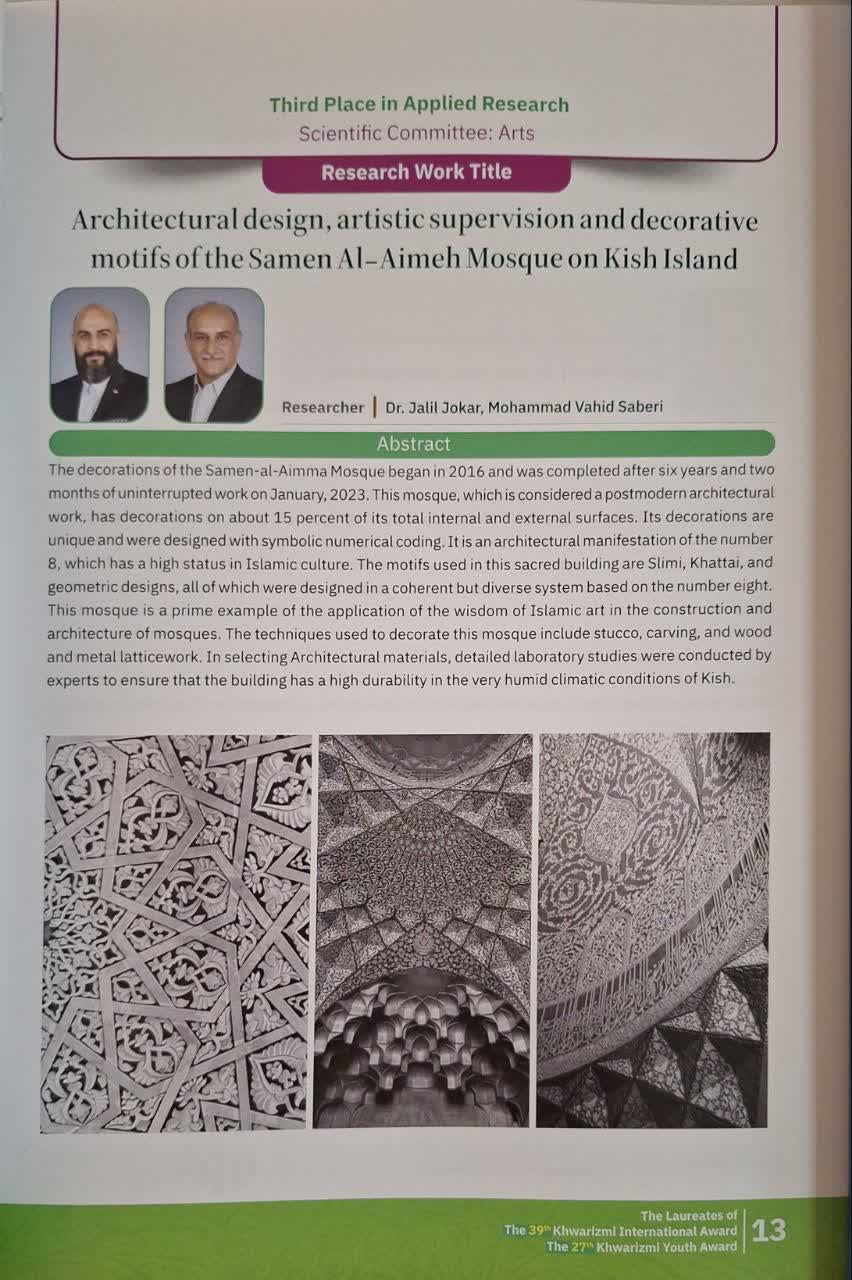 استاد جلیل جوکار عضو هیئت علمی گروه هنر اسلامی دانشکده صنایع دستی دانشگاه هنر اصفهان، به خاطر" طراحی هنری و نظارت بر اجرای تزیینات معماری مسجد ثامن الائمه کیش"، برگزیده نخست بخش هنر از بین 32 طرح هنری رسیده و برگزیده سوم طراحهای کاربردی گردید. شایان ذکر است که حامیان برگزاری رویداد علمی - تخصصی و بین المللی خوارزمی، سازمان جهانی مالکیت معنوی (WIPO)، کمیسیون ملی یونسکو در ایران ، کمیسیون علوم و فنآوری برای توسعه پایدار در جنوب (COMSATA) ، کمیته دائمی همکاری های علمی و فنآوری سازمان همکاری اسلامی (COMSTECH)، مرکز انتقال فنآوری آسیا و اقیانوسیه (APCTT)، انجمن جهانی سازمان های تحقیقات صنعتی و فناوری (WAITRO)، وزارت علوم، تحقیقات و فناوری، سازمان پژوهشهای علمی و صنعتی ایران، بنیاد ملی نخبگان و بنیاد ملی علم ایران می باشند .