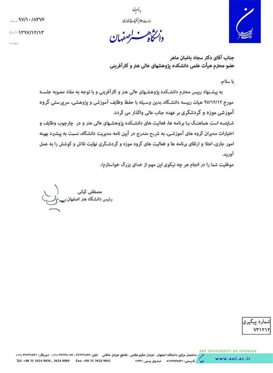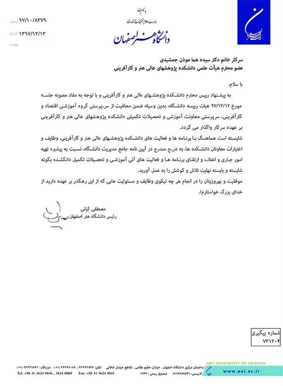 به پيشنهاد رييس دانشكده پژوهش هاي عالي هنر و كارآفريني دانشگاه و با توجه به مفاد مصوبه جلسه 12 اسفند ماه سال جاري هيأت رييسه دانشگاه، ، طي احكامي كه از سوي آقاي دكتر مصطفي كياني رييس دانشگاه هنر اصفهان صادر گرديد، آقاي دكتر سجاد باغبان ماهر، با حفظ وظايف آموزشي و پژوهشي، به عنوان سرپرست گروه آموزشي موزه و گردشگري، آقاي دكتر ناصر يار محمديان، با حفظ وظايف آموزشي و پژوهشي، به عنوان سرپرست گروه آموزشي اقتصاد و كارآفريني و خانم دكتر سيده هما موذن جمشيدي، به عنوان سرپرست معاونت آموزشي و تحصيلات تكميلي دانشكده پژوهشهاي عالي هنر و كارآفريني دانشگاه منصوب گرديدند.